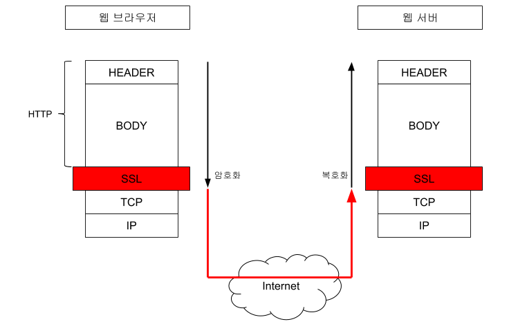 HTTPS는 SSL 레이어 위에 HTTP를 통과 시키는 방식. 즉, 평문의 HTTP 문서는 SSL 레이어를 통과하면서 암호화 되어 목적지에 도착하고 목적지에서는 SSL 레이어를 통과하면서 복화화 되어 웹 브라우저에 전달