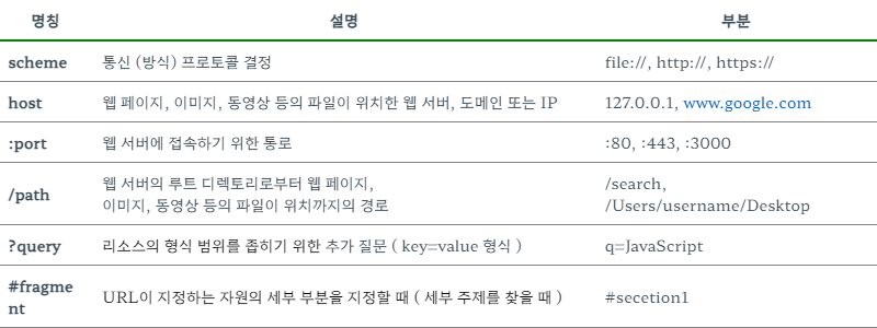 - URL은 일반적으로 4가지 요소로 구성. (Protocol, Host Name = Domain, Port 번호, path or query)
