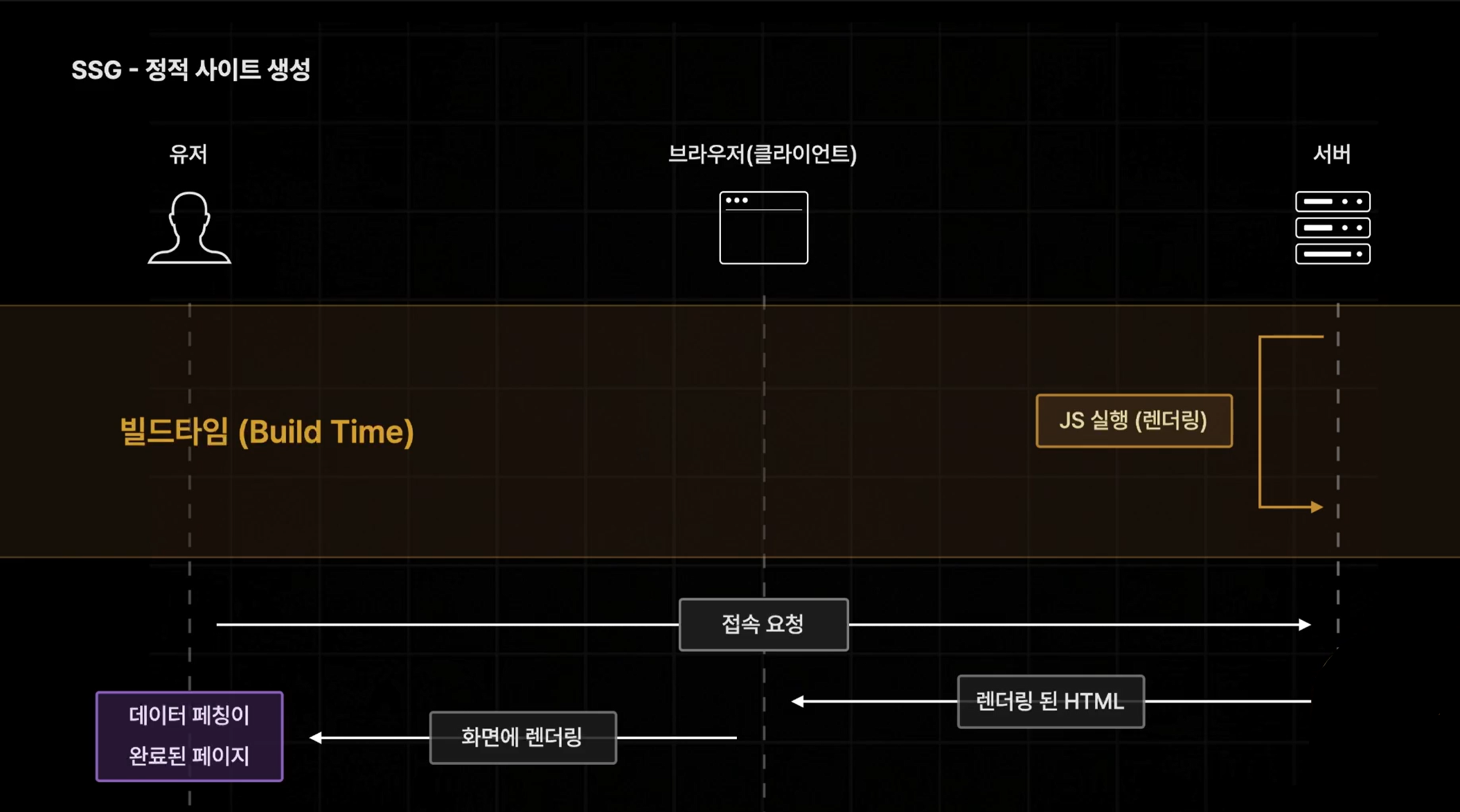 npm run build명령어로 빌드할 때 (=빌드타임) 미리 사전 렌더링 진행