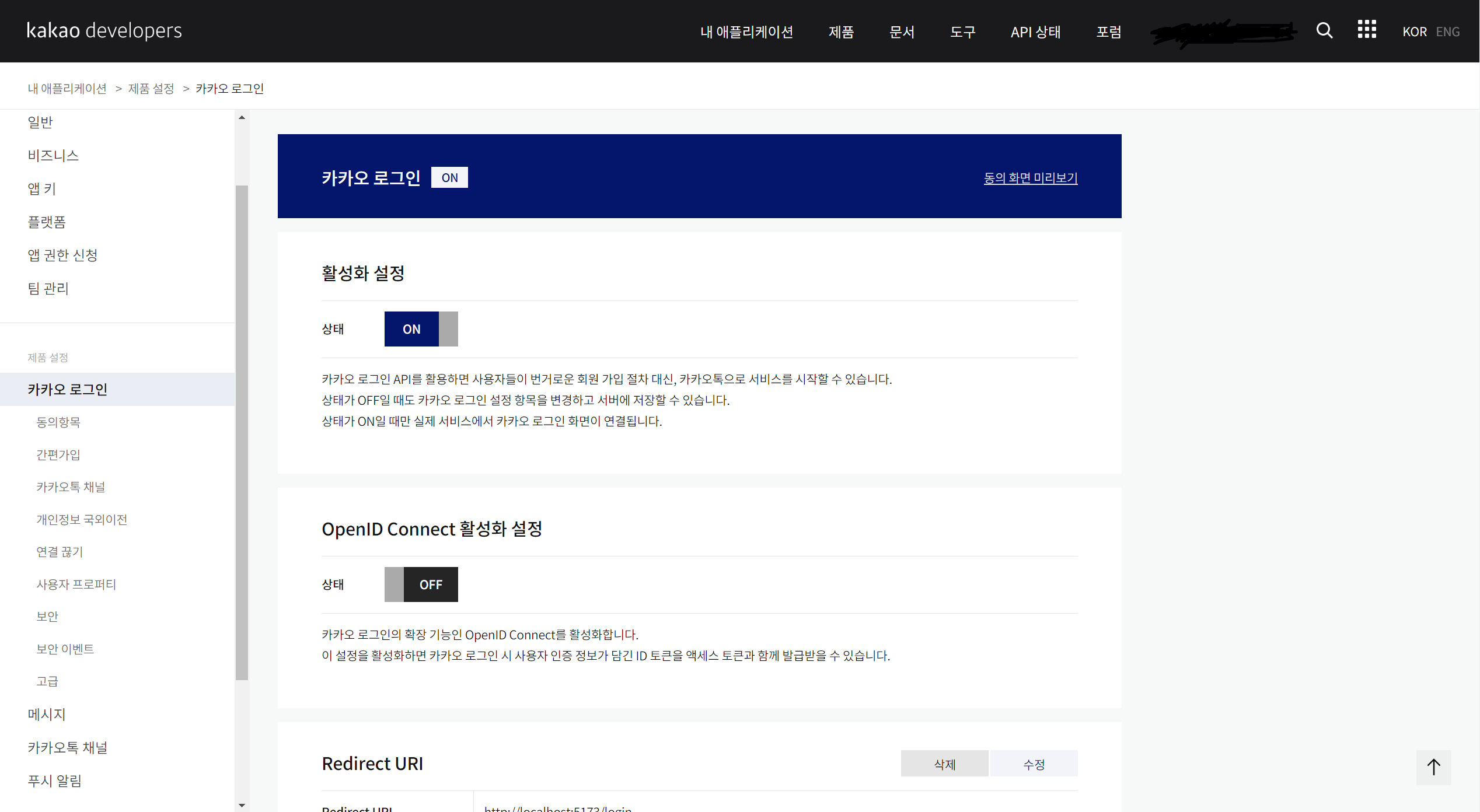앱 대시보드 → 제품 설정 → 카카오 로그인 → 활성화 - Redirect URI 설정