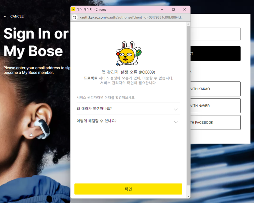 버튼을 누르면 팝업이 띄워지긴 하지만 앱 관리자 설정 오류라고 KOE001 오류 발생.