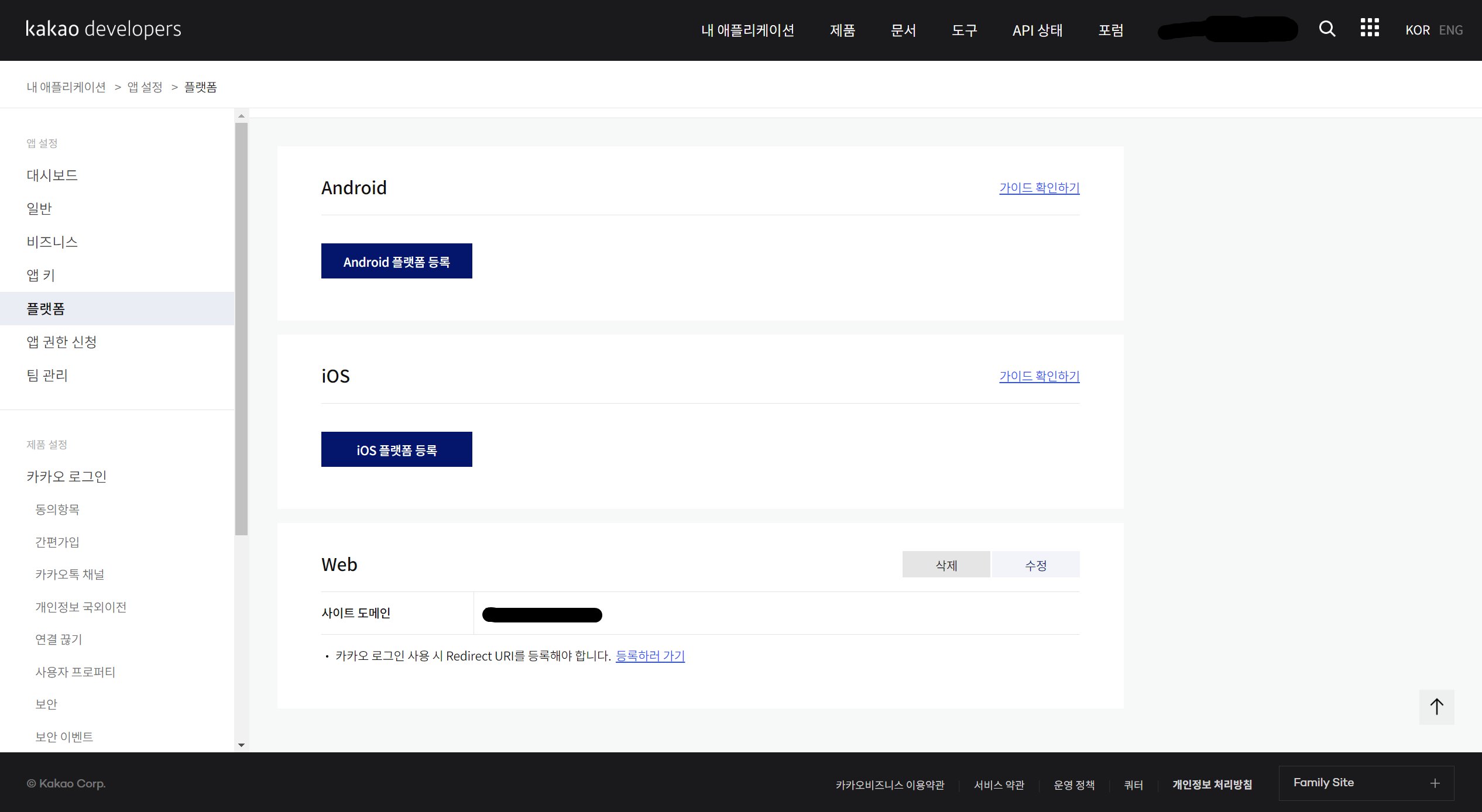 Web 사이트 도메인 추가하고 카카오 로그인에 Redirect URI도 설정.